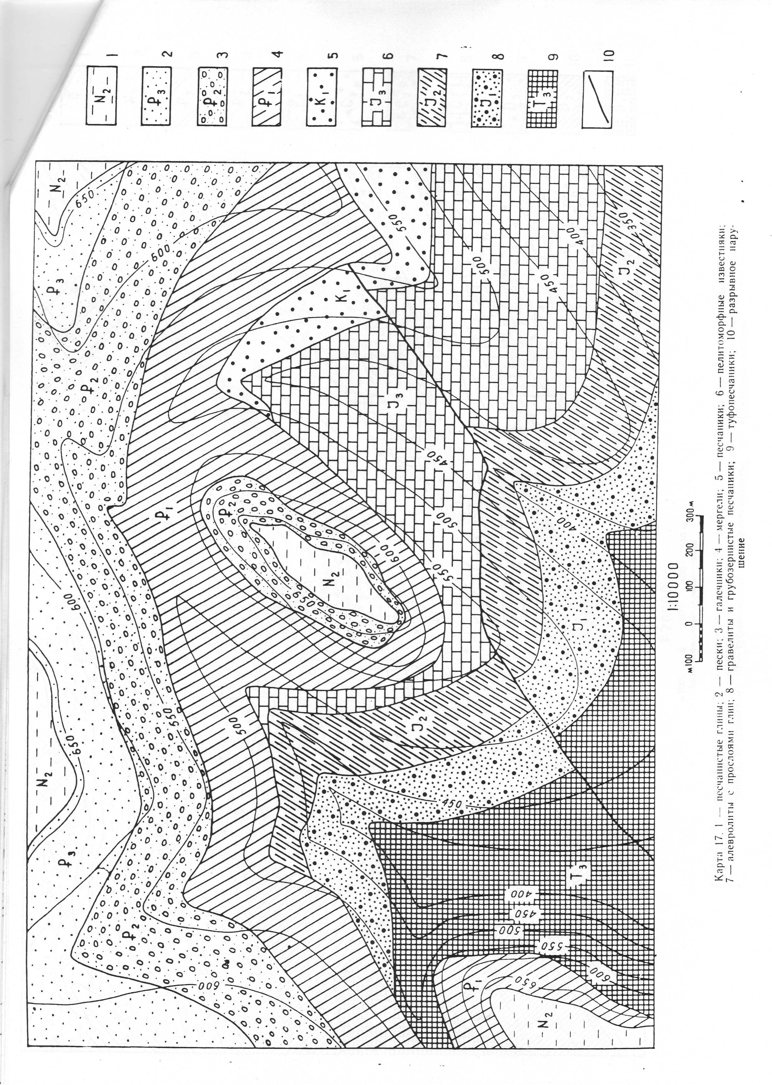 На карте (карта №17) масштаба 1:10000 показаны три разделенные несогласиями толщи пород. Нижняя из них, относящаяся к мезозою, и средняя – палеогеновая- наклонены в различных направлениях. Вышележащие породы плиоцена залегают горизонтально. Имеется поперечный разрыв, затрагивающий только нижнюю толщу.