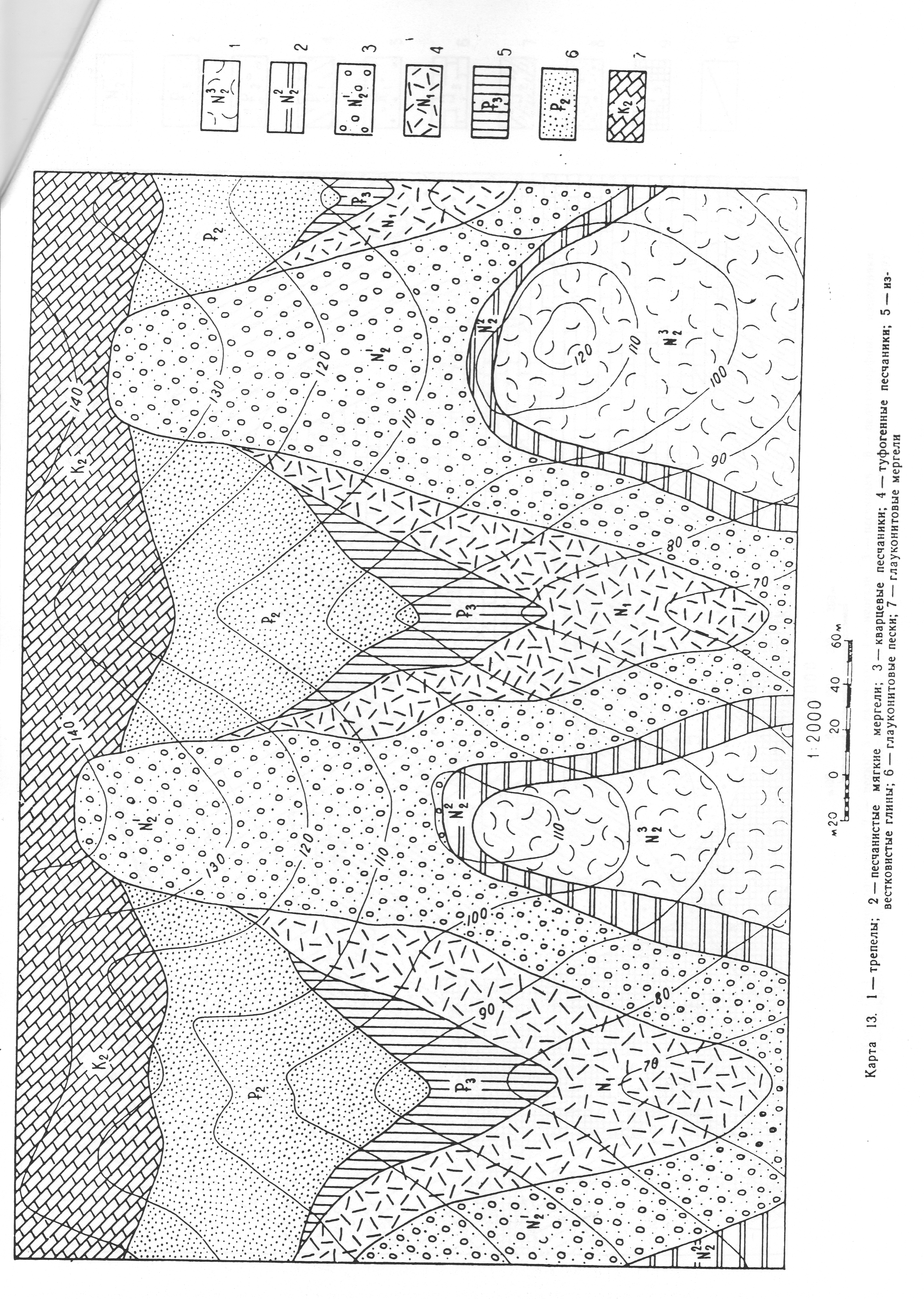 На карте (карта №13) масштаба 1:2000 представлено несколько моноклинально залегающи пачек, характеризующихся различной величиной наклона в одном и том же направлении. Крутизна падения слоев уменьшается вверх по стратиграфическому разрезу.