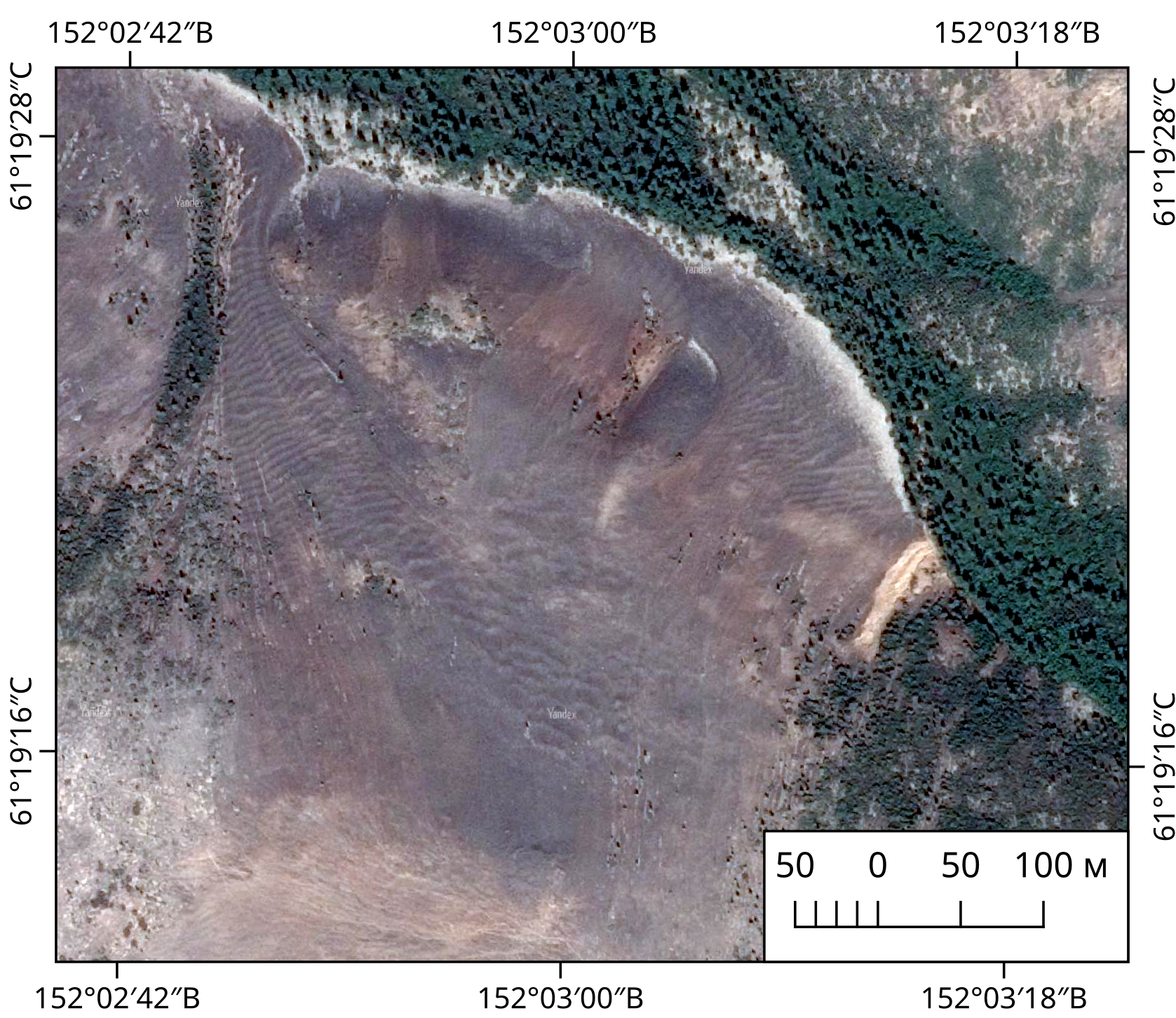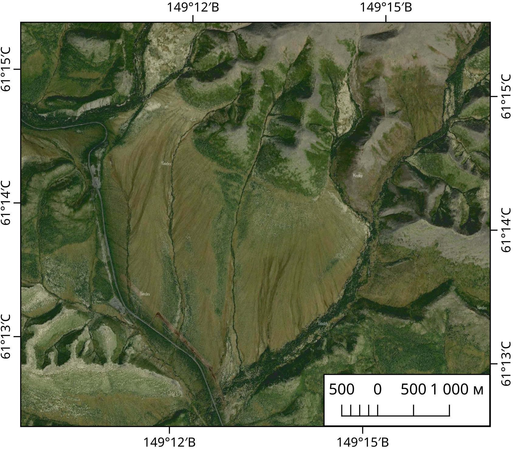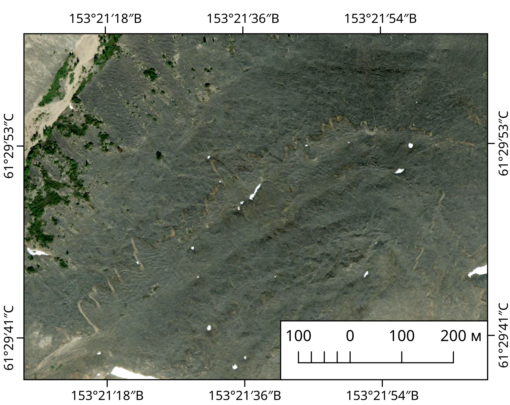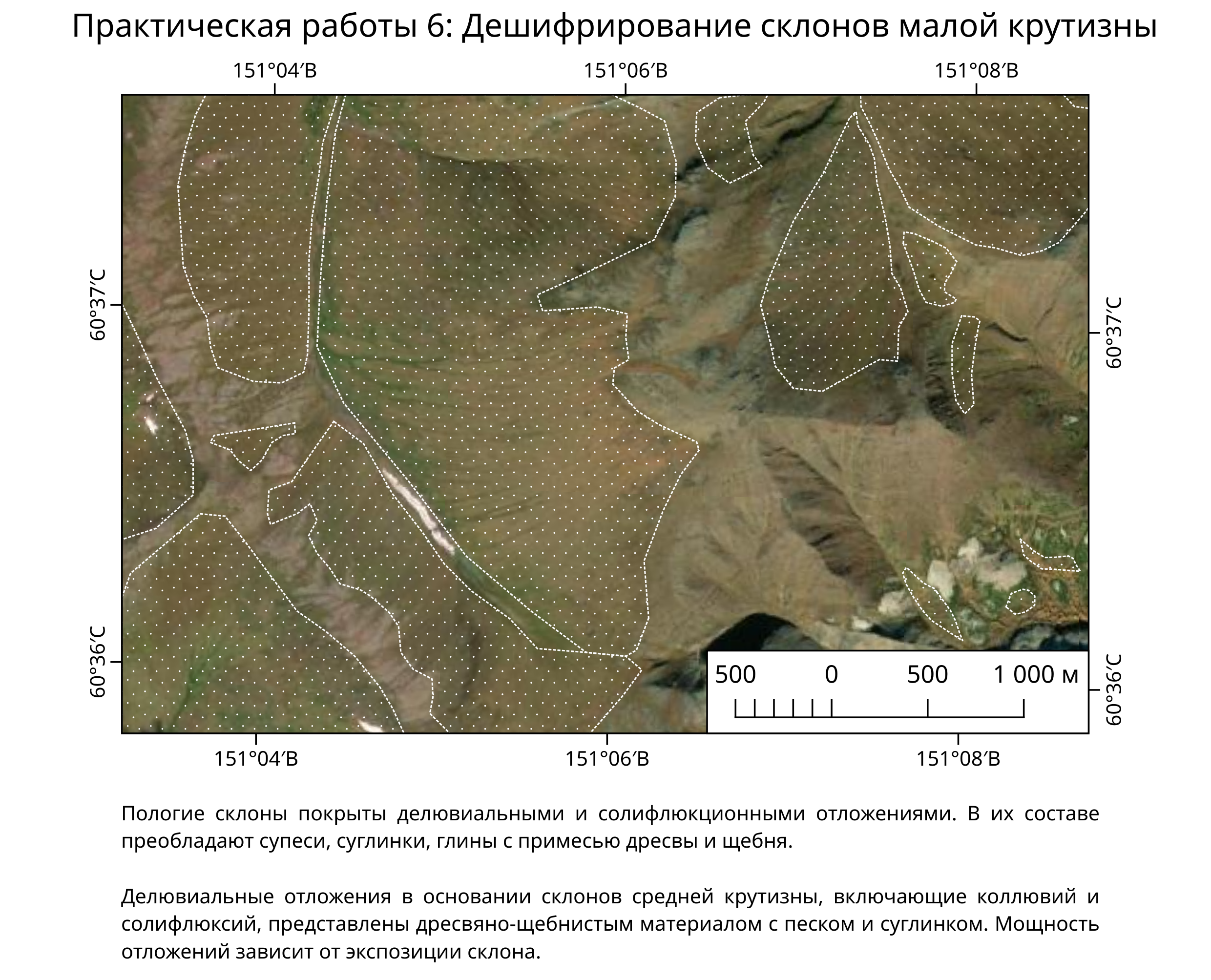 С использование XYZ-слоев космоснимков (Яндекс и др.), и с привлечением ЦМР (главным образом карты крутизны склонов) необходимо отдешифрировать на космоснимке различные по рисунку и фототону элементы строения горных склонов малой крутизны: водораздельные выровненные поверхности, делювиальные и солифлюкционные участки склонов и другие характерные формы. Определить размеры и дать их морфологическое описание.