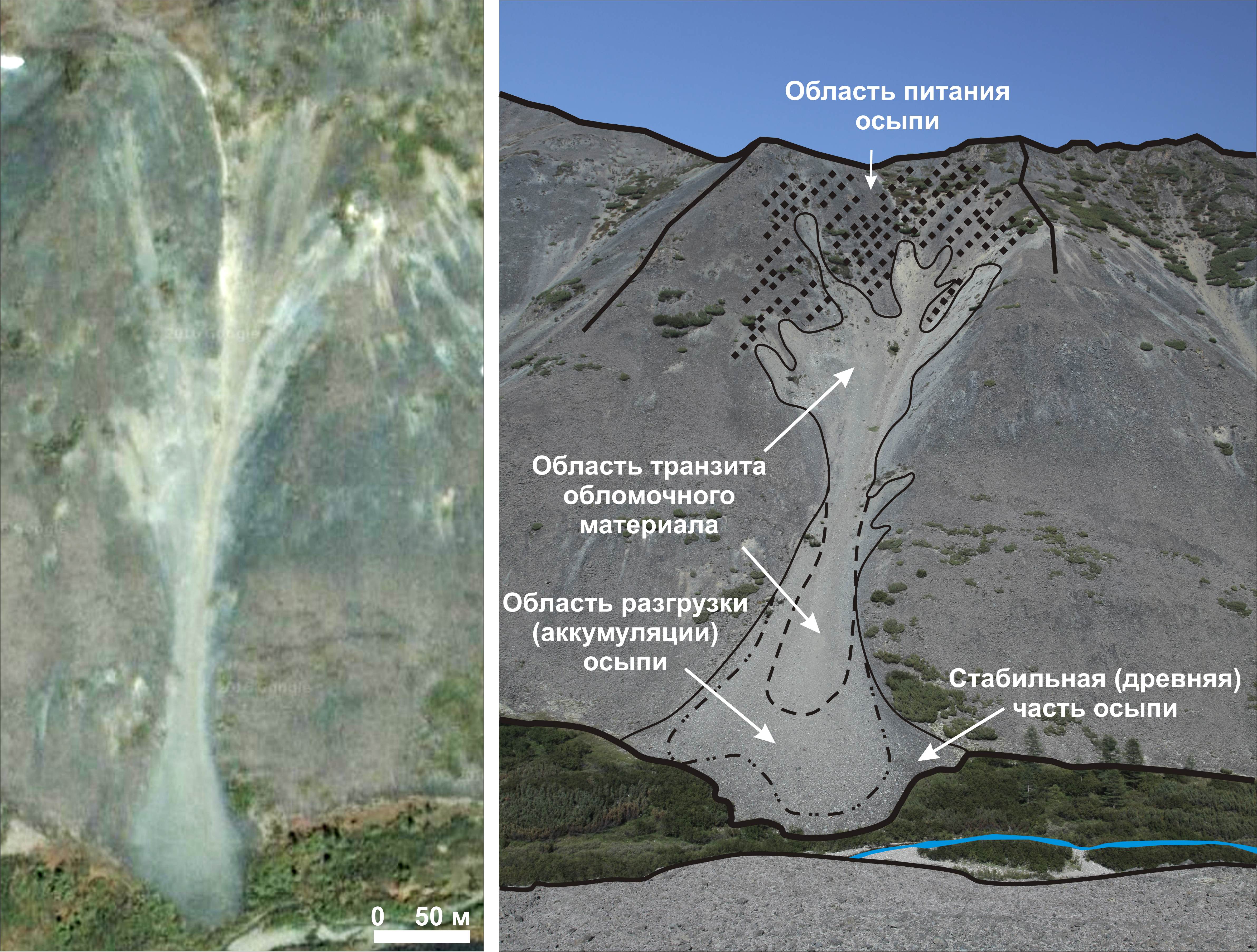 Далее показаны космоснимок (слева) и перспективная фотография (справа) осыпи.