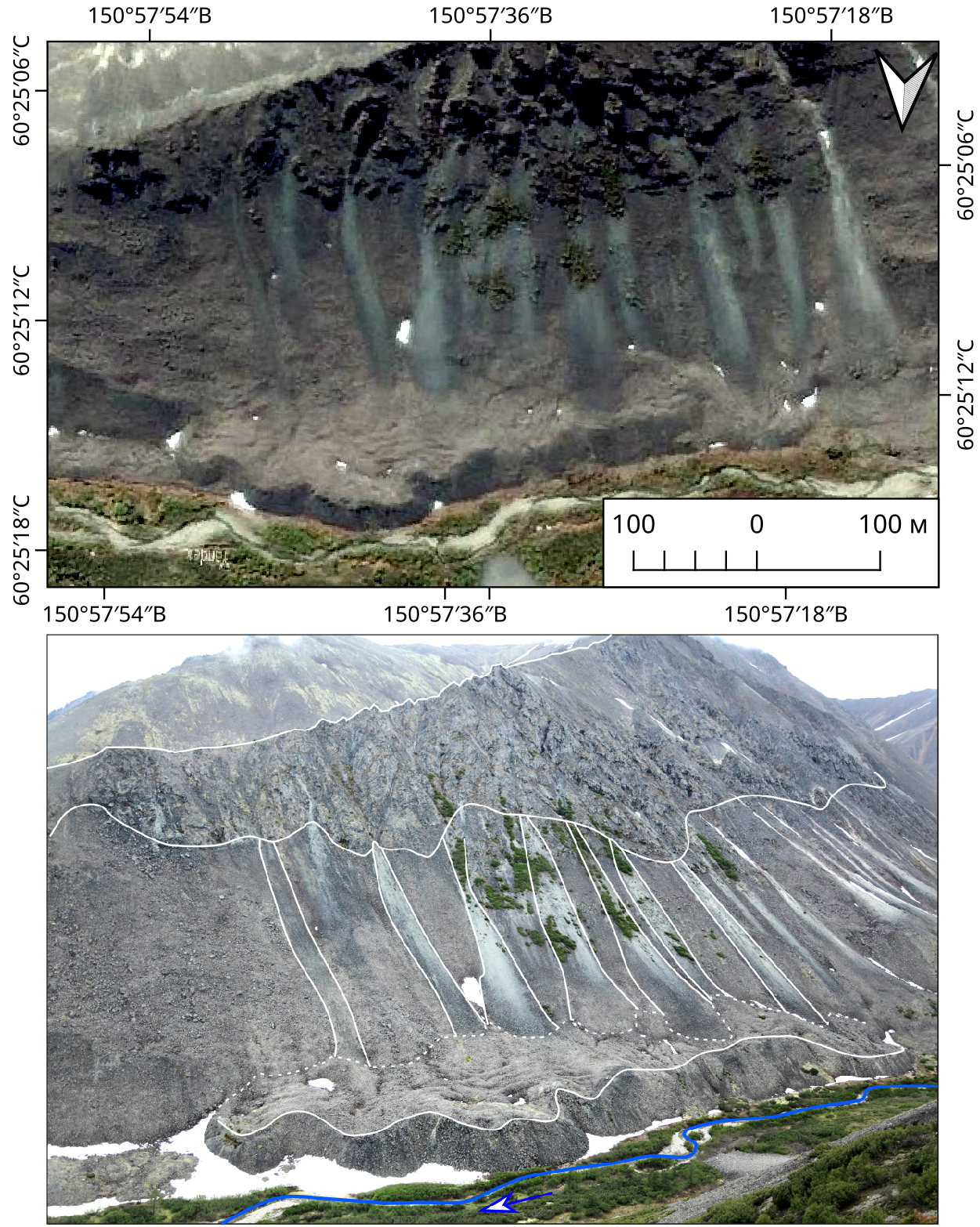 Далее показаны космоснимок присклонового каменного глетчера (сверху) и перспективная фотография (снизу).
