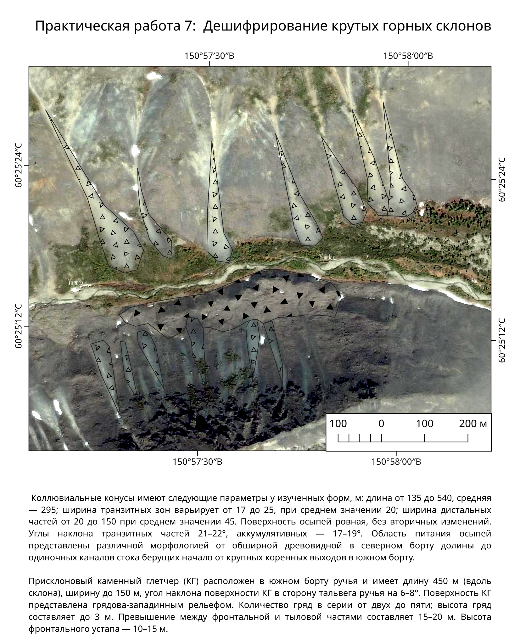 С использование XYZ-слоев космоснимков (Яндекс и др.), и с привлечением ЦМР (главным образом карты крутизны склонов) необходимо отдешифрировать на космоснимке различные по рисунку и фототону элементы строения крутых горных склонов и бортов долин: участки обвально-осыпного сноса, коллювиальные конусы и шлейфы подножий. Определить размеры и дать их морфологическое описание.