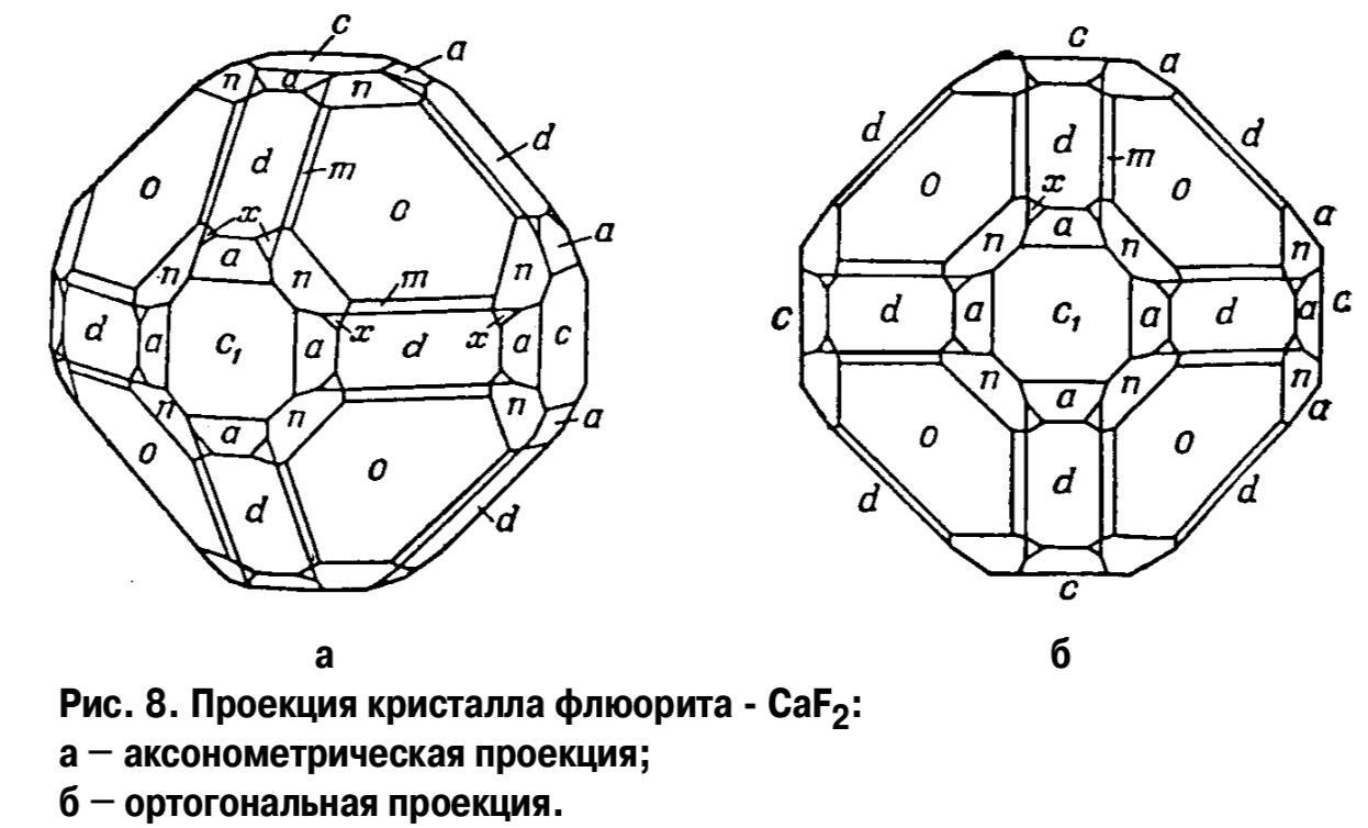 В кристаллографии для этого пользуются обычно двумя методами:образным, или перспективным (ортогональные и аксонометрические проекции) (рис. 8) и графическим (графические проекции). В последнем случае кристалл может проектироваться на