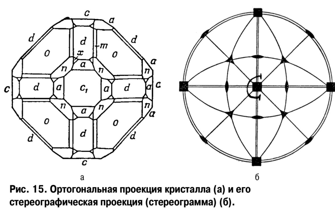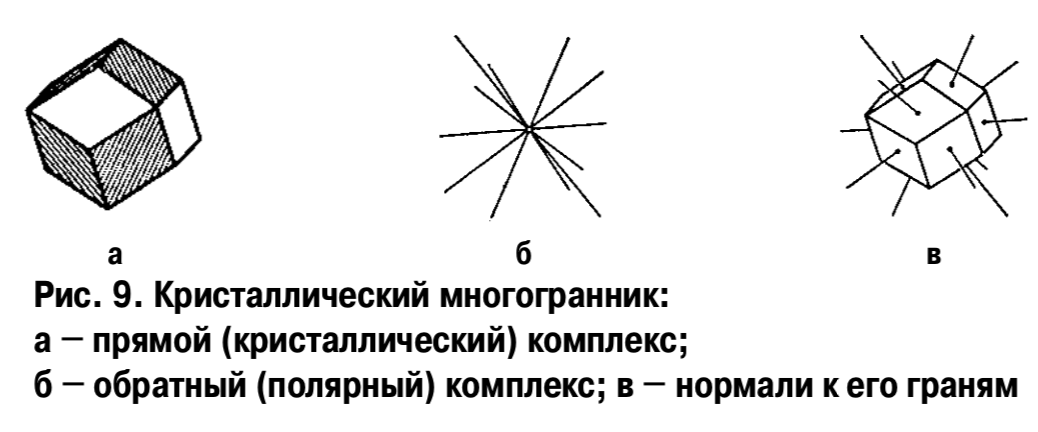 виде обратного (полярного) комплекса (рис. 9б). В последнем случае каждая грань кристалла заменяется на нормаль к ней, которая и проектируется (рис. 9в).
