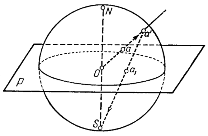 Чтобы спроектировать точку a, находящуюся внутри сферы с определенным радиусом, на поверхность сферы, проводим из центра O через точку a прямую до пересечения со сферой; полученная при этом точка a' сферическая проекция точки a. Соединяя точку a' с южным (нижним) полюсом S, получим на плоскости P точку a1 - стереографическую проекцию точки a (рис. 12).