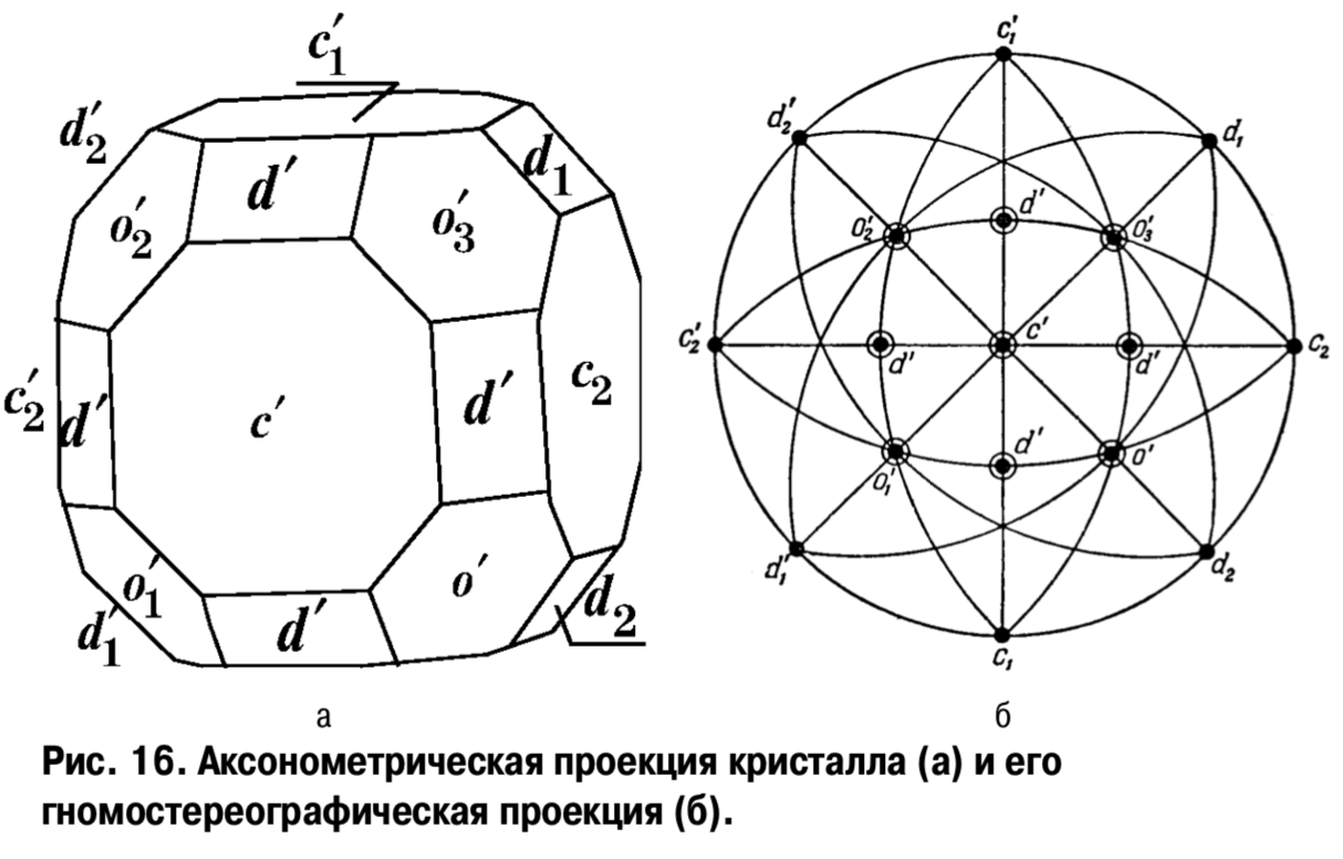 (полярному) комплексу. Иногда их совмещают на одном чертеже, изображая элементы симметрии кристалла с помощью стереографической проекции, а грани и ребра – с помощью гномостереографической.