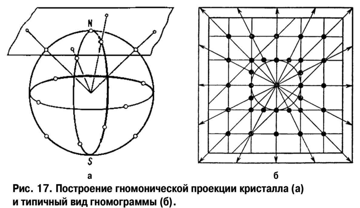 Плоскость гномонической проекции параллельна плоскости стереографической и гномостереографической проекций, но она не экваториальная, а касательная к северному полюсу сферы проекции. Нормаль к грани кристалла, проведенная из центра сферы проекций, продолжается