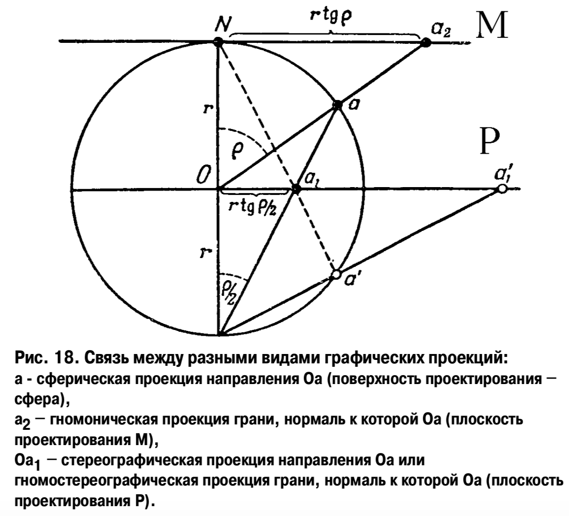 стереографическая проекция направления Oa. На гномонической проекции (плоскость проектирования М) точка a2 – гномоническая проекция той же плоскости, нормаль к которой Oa. (рис. 18).