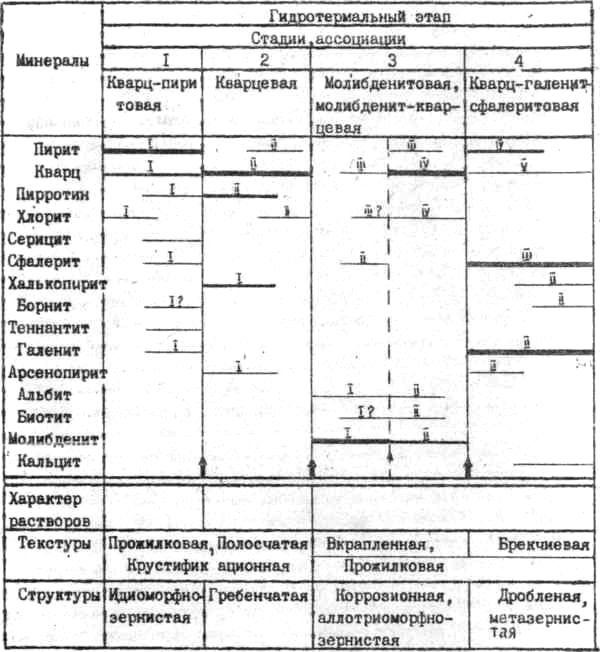 На схеме могут быть отмечены многие особенности процесса рудообразования – минеральный состав руд, парагенетические минеральные ассоциации, структура и текстура руды, этапы и стадии минерализации, геохимические и физико-химические особенности процесса рудообразования. Вверху схемы перечисляются слева направо этапы, стадии минерализации от ранних к поздним.
