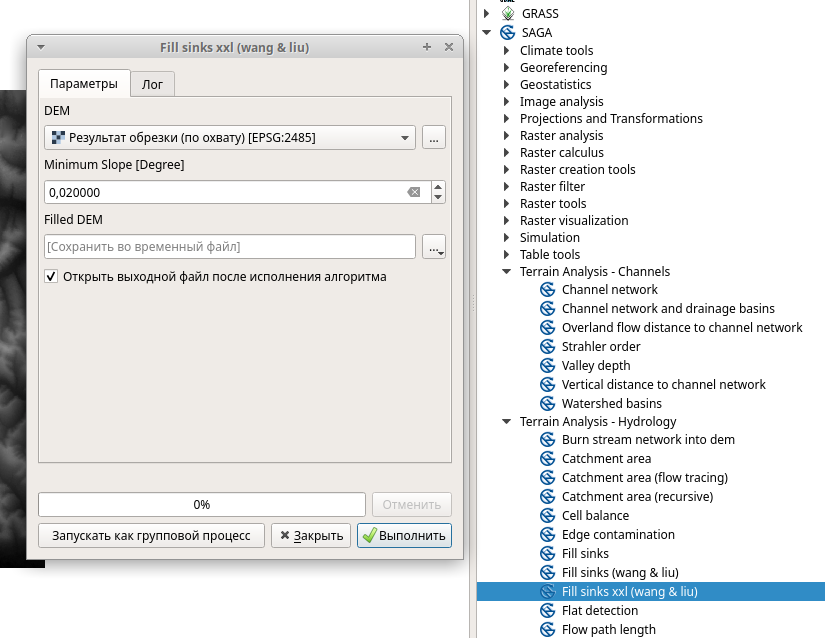 Для расчета порядка рек, сначала необходимо сгладить модель рельефа от каверн и западин. Для этого мы воспользуемся встроенным функционалом ГИС SAGA, перейдите в Инструменты анализа - SAGA - Terrain Analysis-Hydrology - Fill sinks xxl (wang & liu). В появившемся окне в пункте DEM указывайте результат обрезки (по охвату), в пункте Minimum Slope указываем 0,02 градуса, в пункте Filled DEM указываем куда сохранить растр.