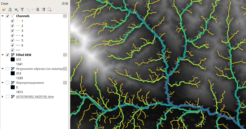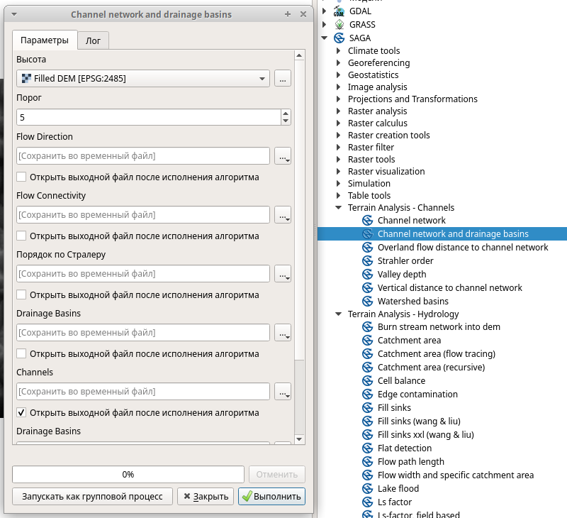 Для расчета порядков гидросети перейдите Инструменты анализа - SAGA - Terrain Analysis-Сhannels - Channel network and drainage basins. В появившемся окне в пункте высота указываем сглаженный растр (Filled DEM), порог оставляем стандартный (5), все выводные карты выключаем кроме Channels, где указываем куда сохранить файл, нажимаем выполнить.