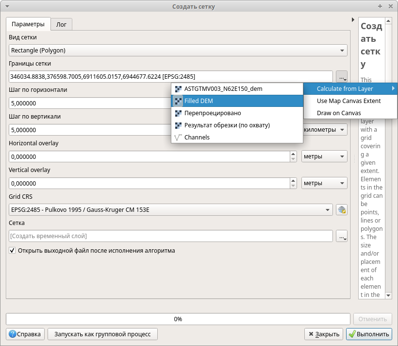 Для создание полигональной (квадратной) сети перейдите по основному меню Вектор - Выбор - Создать сетку. В появившимся окне в пункте Вид сетки выбираем Прямоугольную (Rectangle (Polygon)), Границы сетки устанавливаем по расчёту из границ растра, Шаг по горизонтали и вертикали устанавливаем 5 км. Нажимаем Выполнить, сохраняем слой в память.