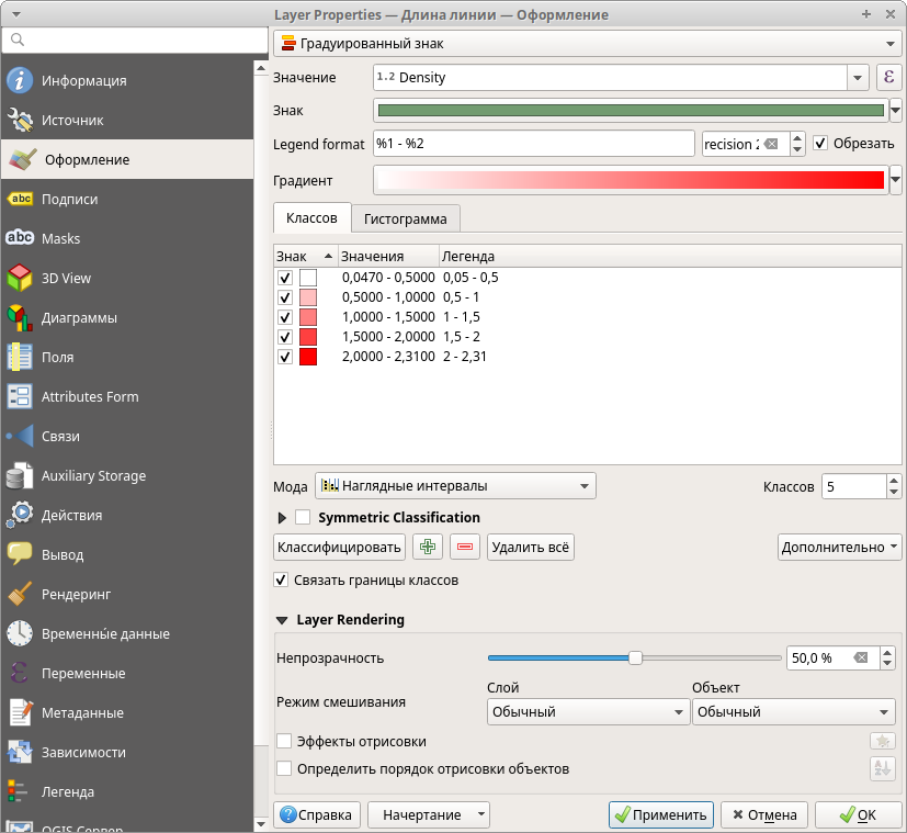 Далее приводим оформление в подобающий вид. Выбираем Градуированный знак, Значение определяем полем Density, устанавливаем Градиет, указываем Моду - Наглядные интервалы, Непрозрачность устанавливаем в 50%, в подписях настраиваем отображение толщин, цветов и размеров.