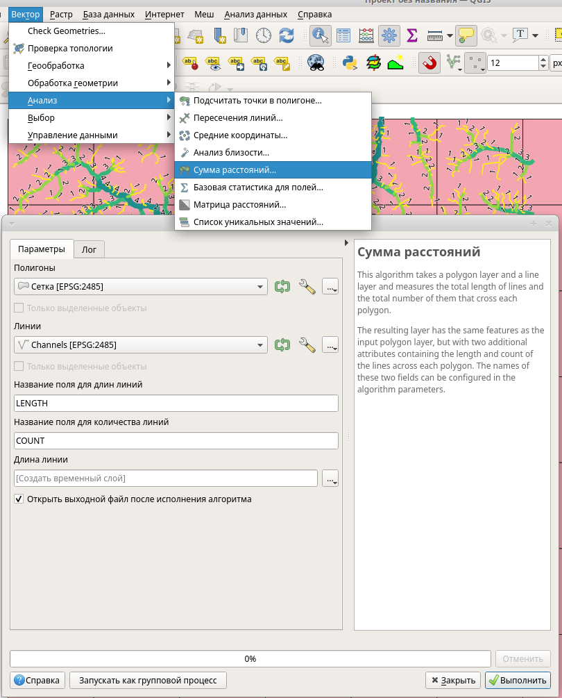Для проведение подсчета длины гидросети в каждом полигоне пройдите по основному меню Вектор - Анализ - Сумма расстояний. В появившемся окне в пункте Полигоны указываем Сетку полигонов, в пункте Линии указываем уже отстроенные водотоки.  Указываем куда сохранить файл. Нажимаем выполнить.