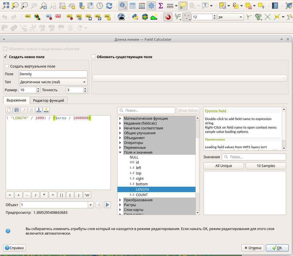 Далее нам надо рассчитать собственно густоту гидросети, для этого выделяем нужный слой, переходим в калькулятор полей. Создаем новое Поле Density, Тип - десятичное число, в редакторе указываем следующее выражение - ( "LENGTH" / 1000) / ($area / 1000000). Так как итоговые единицы измерения км на км2, мы переводим метры в километры.