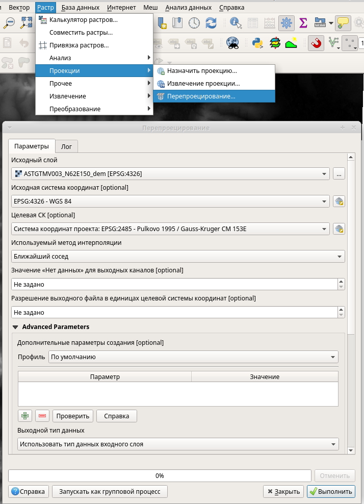 Так как дальнейшие функции по расчёту порядков водотоков и густоты гидросети корректно работают только в метровой системе координат, перепроецируем наш растр (GMTED или ASTER GDEM в географической, Arctic DEM уже в метровой системе). Для этого переходим по основному меню во вкладки Растр - Проекции - Перепроецирование. В открывшемся меню в пункте Исходный слой выбираем наш растр, в Исходной системе координат можете указать изначальную систему, в пункте Целевая СК указать метровую, в нашем случае Гаусс-Крюгер 153Е, в пункте Используемый метод интерполяции выбираем Кубический сплайн для более точного преобразования. Нажимаем выполнить (растр сохраниться в память и после перезапуска компьютера будет стерт из памяти).
