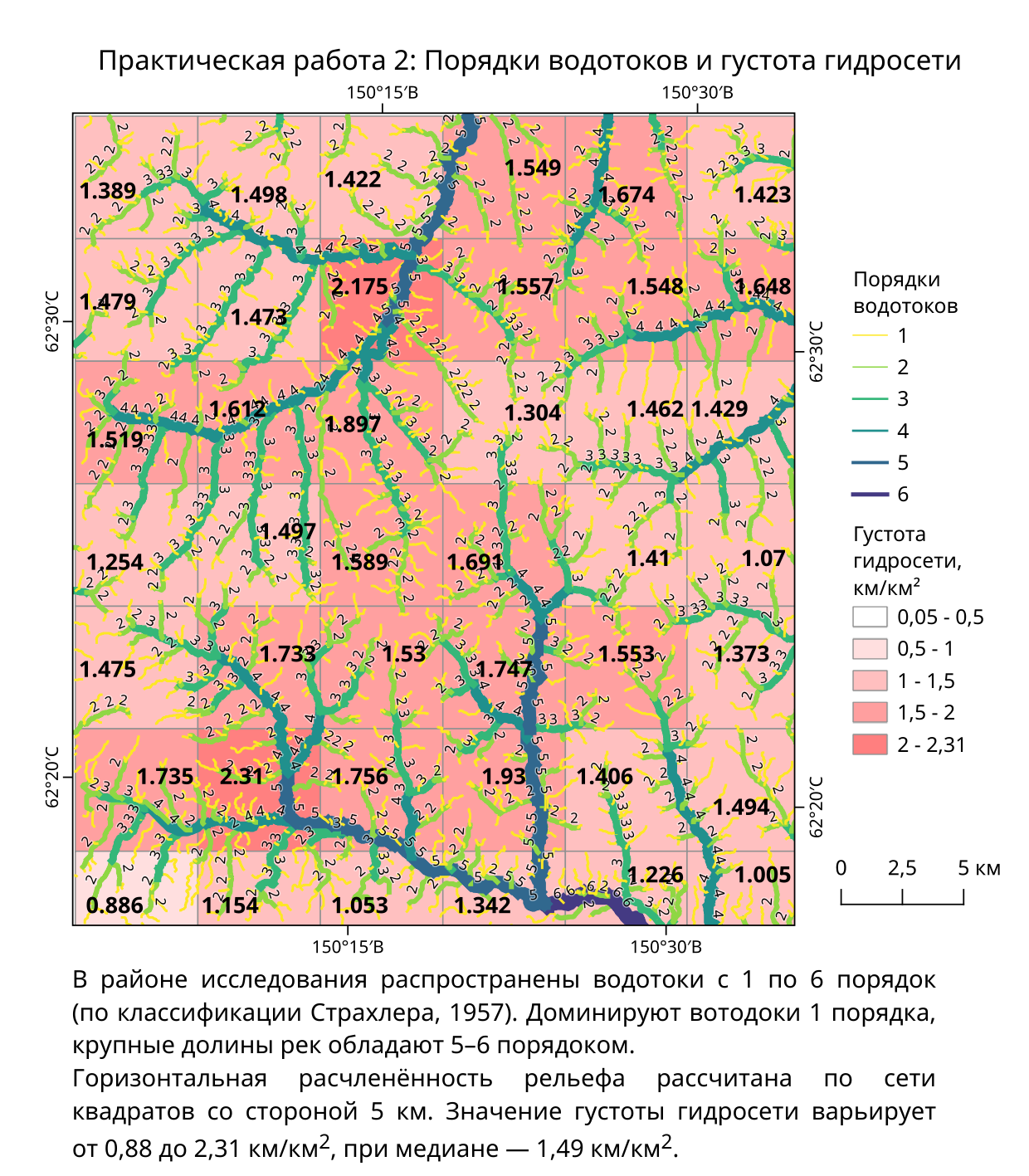 5. расчет густоты гидросети, сумма расстояний, расчет плотности, оформление;